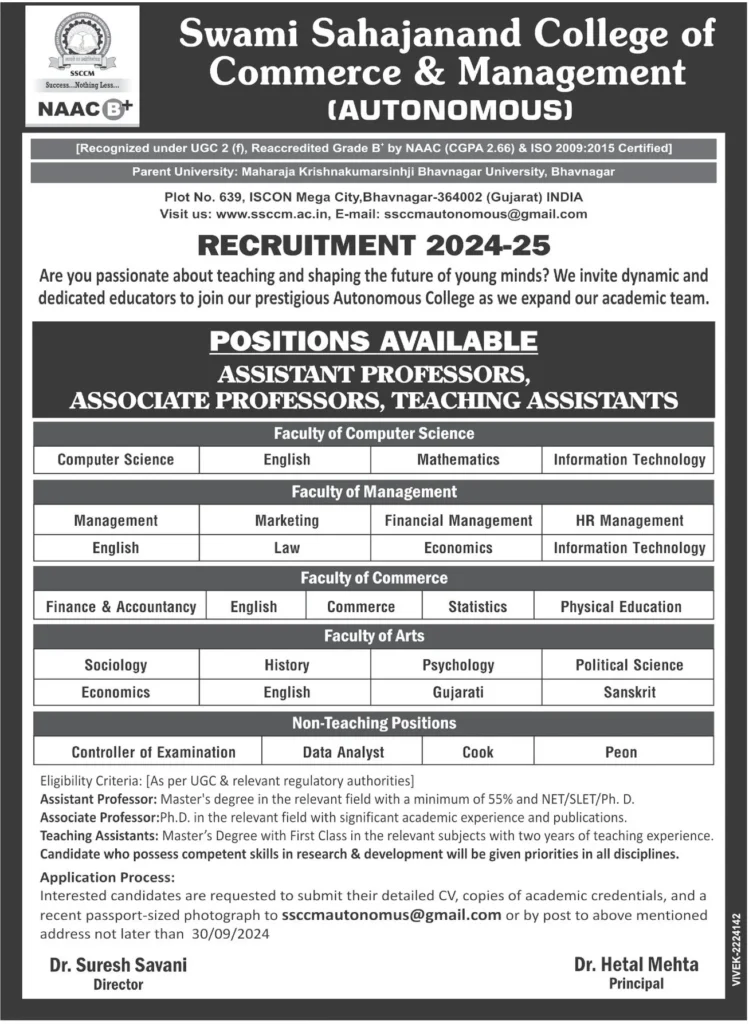 Swami Sahajanand College of Commerce & Management Recruitment 2024. Swami Sahajanand College has invited applications for the recruitment of Various Teaching and Non Teaching Posts 2024. Swami Sahajanand College of Commerce & Management has published an Advertisement for the below-mentioned Posts. Eligible Candidates are advised to refer to the official advertisement and apply for this post.